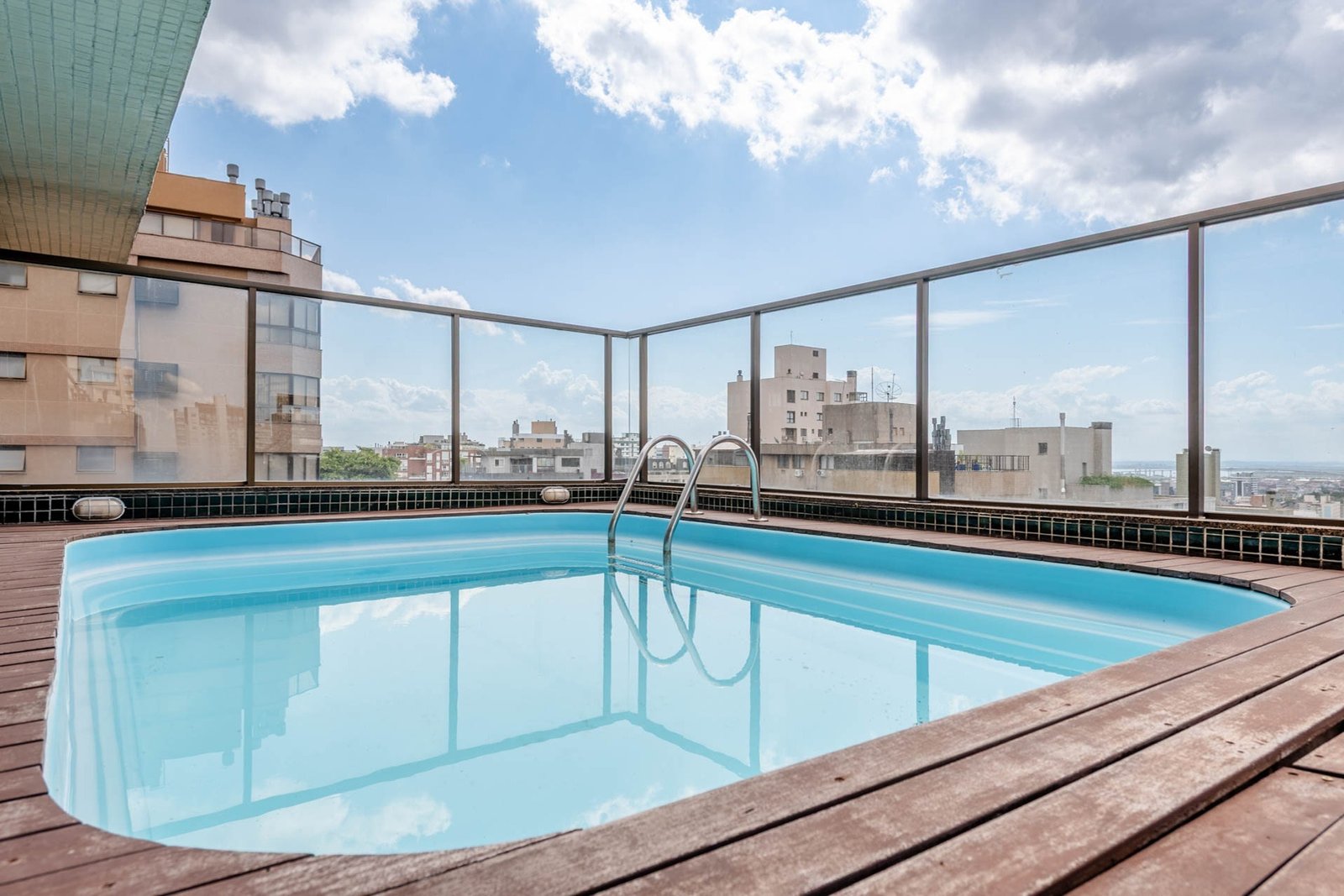 Área de lazer na cobertura do prédio com salão de festas, espaço gourmet, fitness, churrasqueira e piscina.