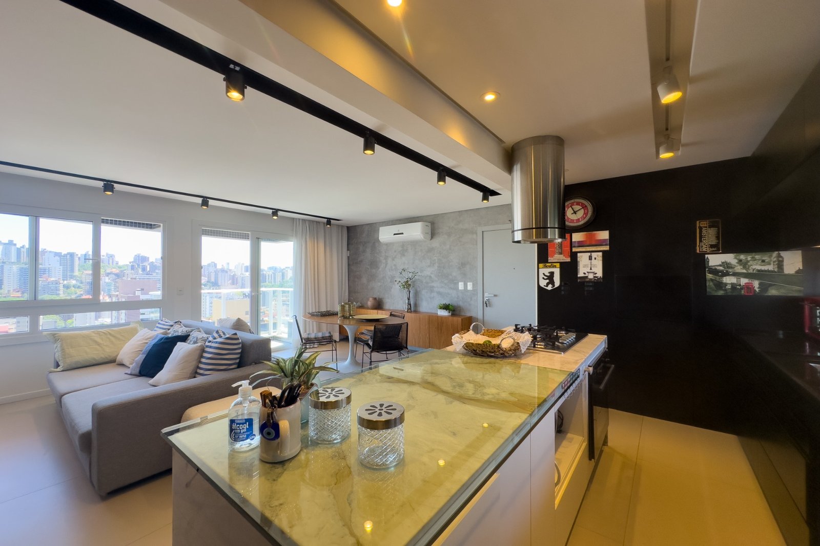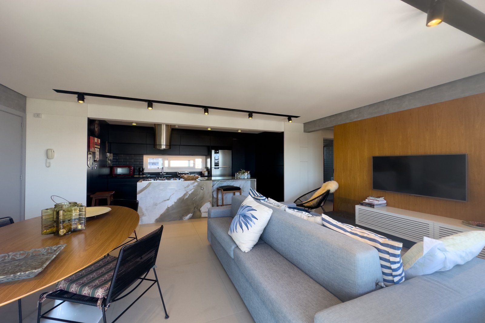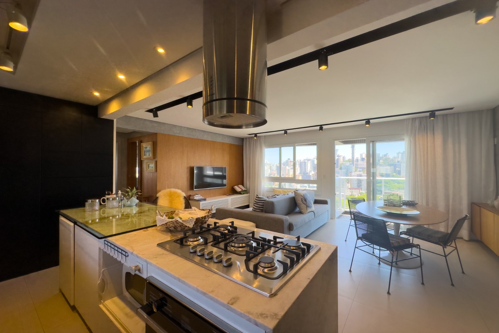 Living para 2 ambientes, luminosidade com sol da manhã e da tarde, cozinha americana com churrasqueira e sacada.