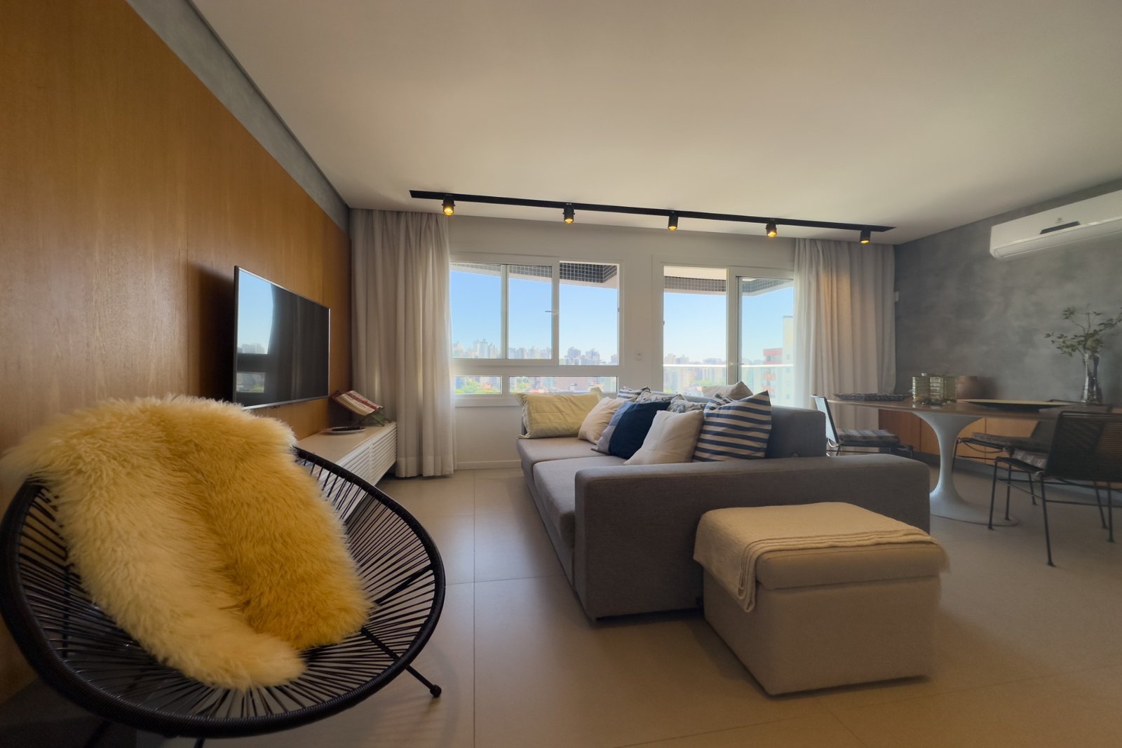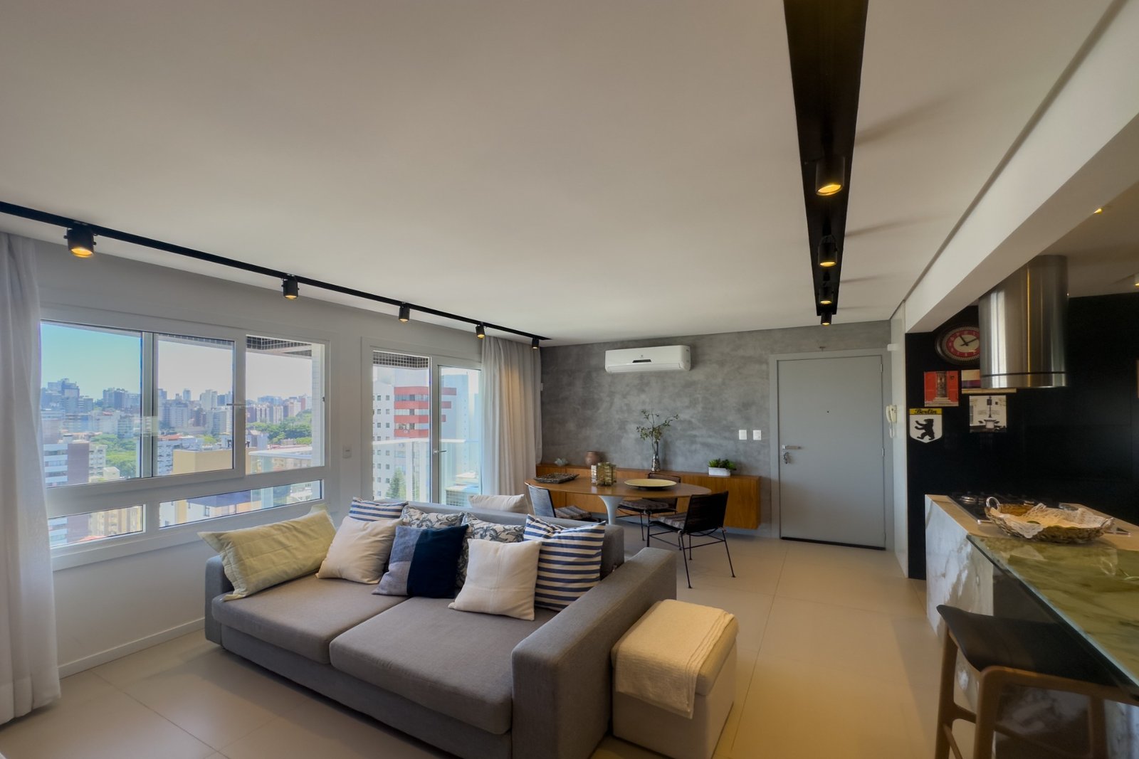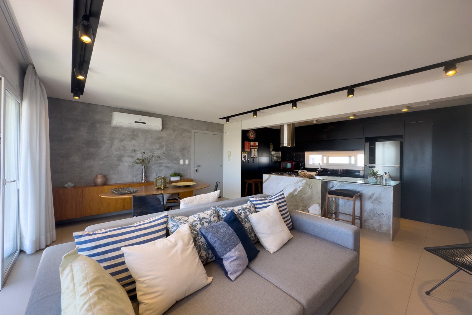 Living para 2 ambientes, luminosidade com sol da manhã e da tarde, cozinha americana com churrasqueira e sacada.