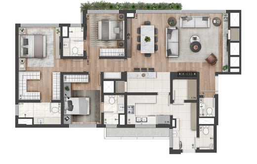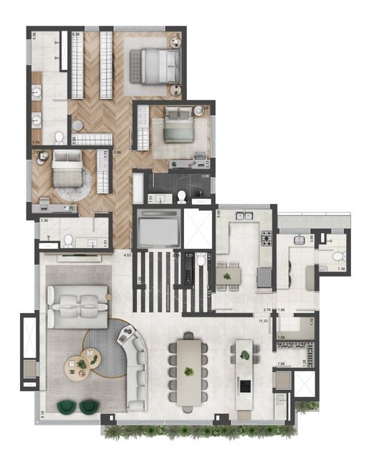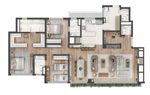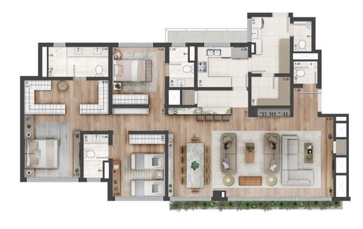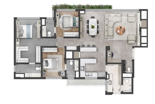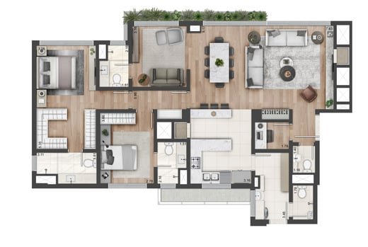 Apartamentos com 170m², 3 suítes, master com closet, living 3 ambientes, lareira, lavabo, opção com home office, cozinha, churrasqueira, área de serviços, banheiro auxiliar e 2 ou 3 vagas de garagem.