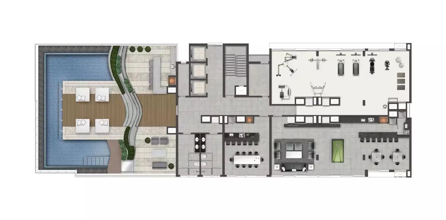Além da torre residencial, há uma torre comercial com espaço coffe bar, elevador para macas, sala de reuniões e bicicletário.