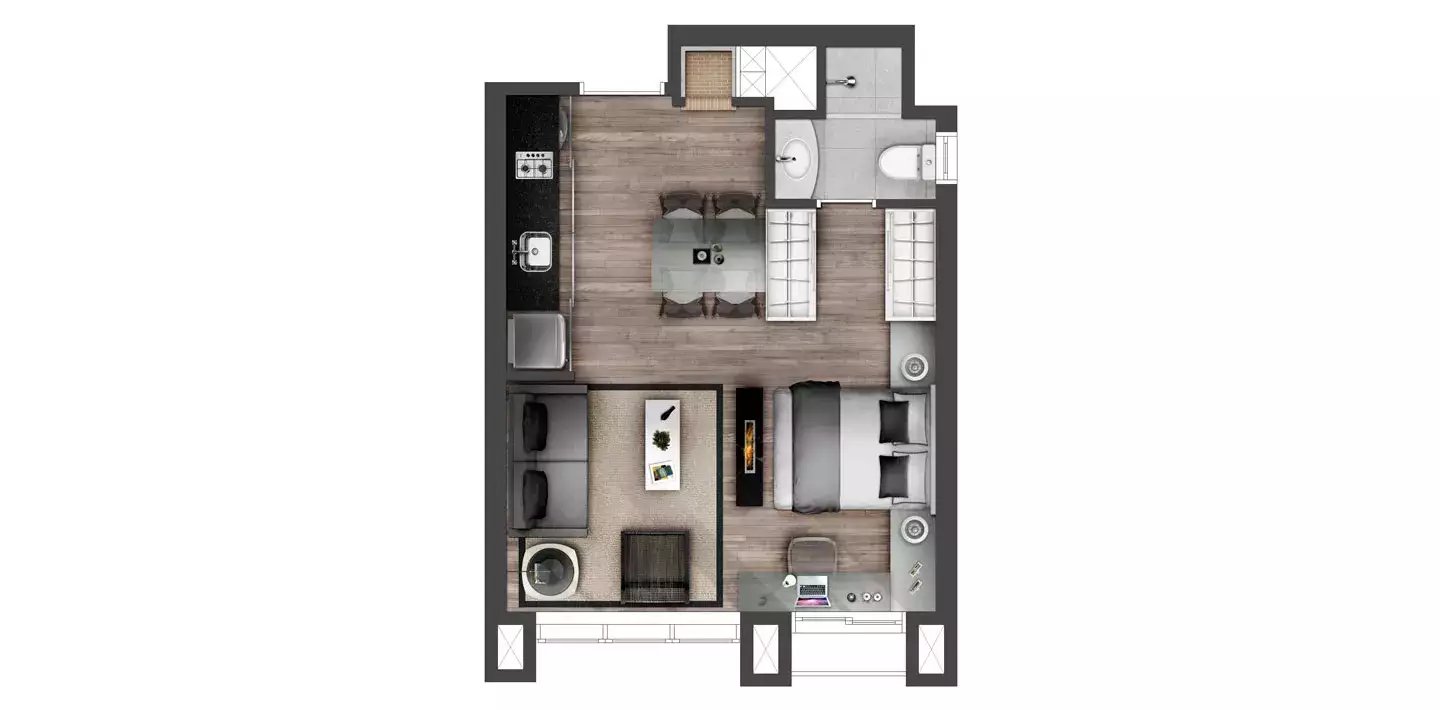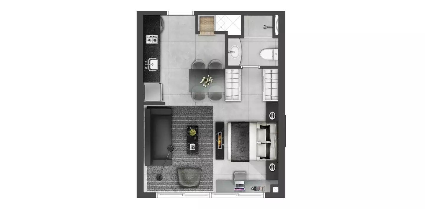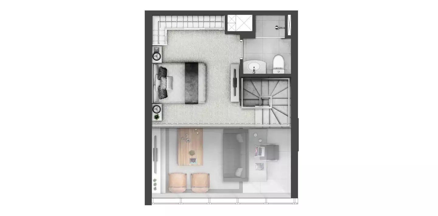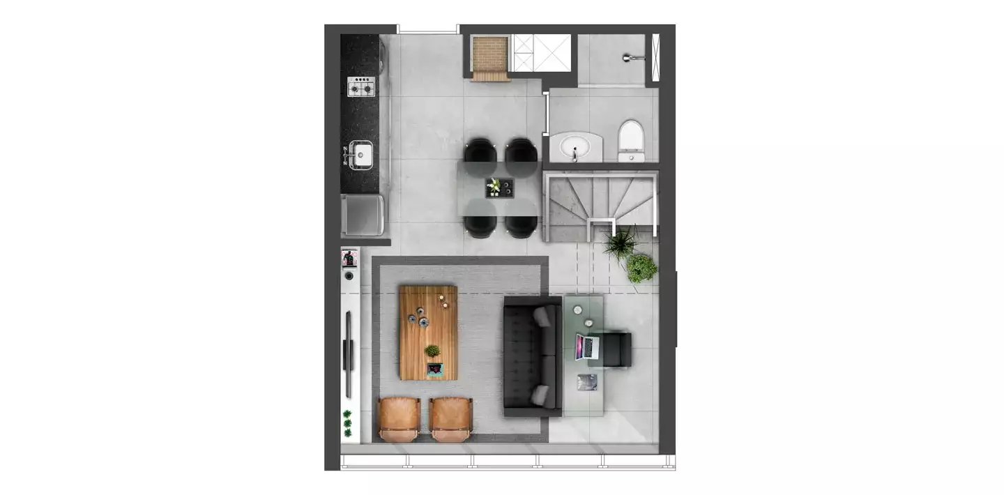 Lofts com 37m² a 39m², 1 dormitório, banheiro social, living integrado a cozinha, lavabo, churrasqueira e 1 vaga de garagem.
