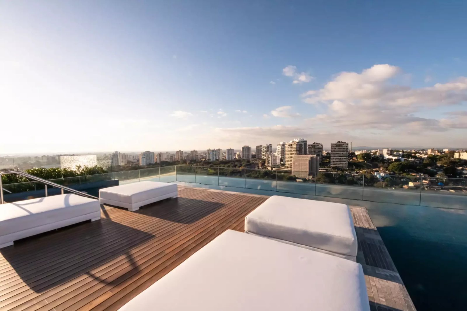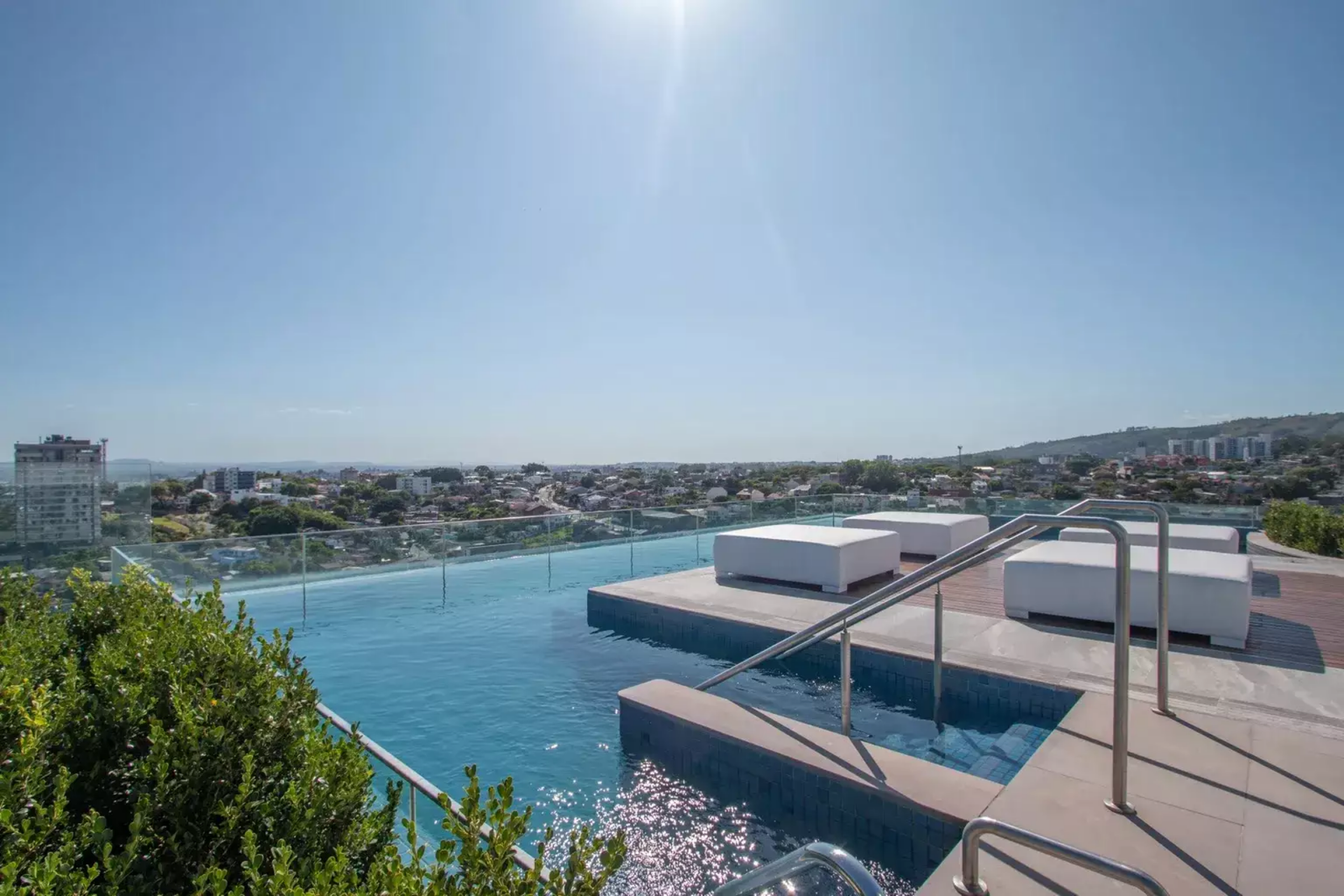Área de lazer com piscina com borda de vidro, espaço fitness, lavanderia, salão de festas com espaço gourmet e área de jogos.