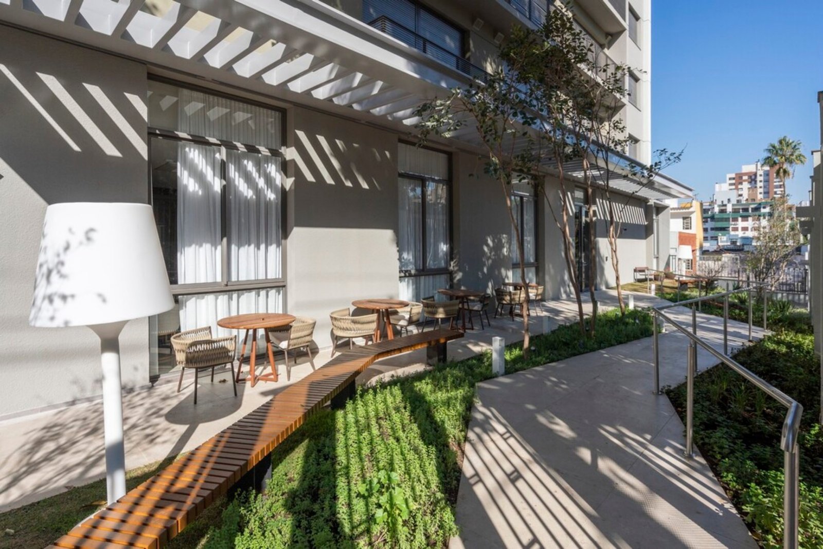 Pórtico com acessos diferenciados para pedestres, veículos e boardingplace(vaga para embarque e desembarque), lounge das frutíferas em área externa integrada ao paisagismo, espaço multiuso destinado à realização de atividades físicas e culturais, podendo ser adaptada de acordo com a necessidade,lobby com área de convívio e biblioteca,espaço hometheater confortável