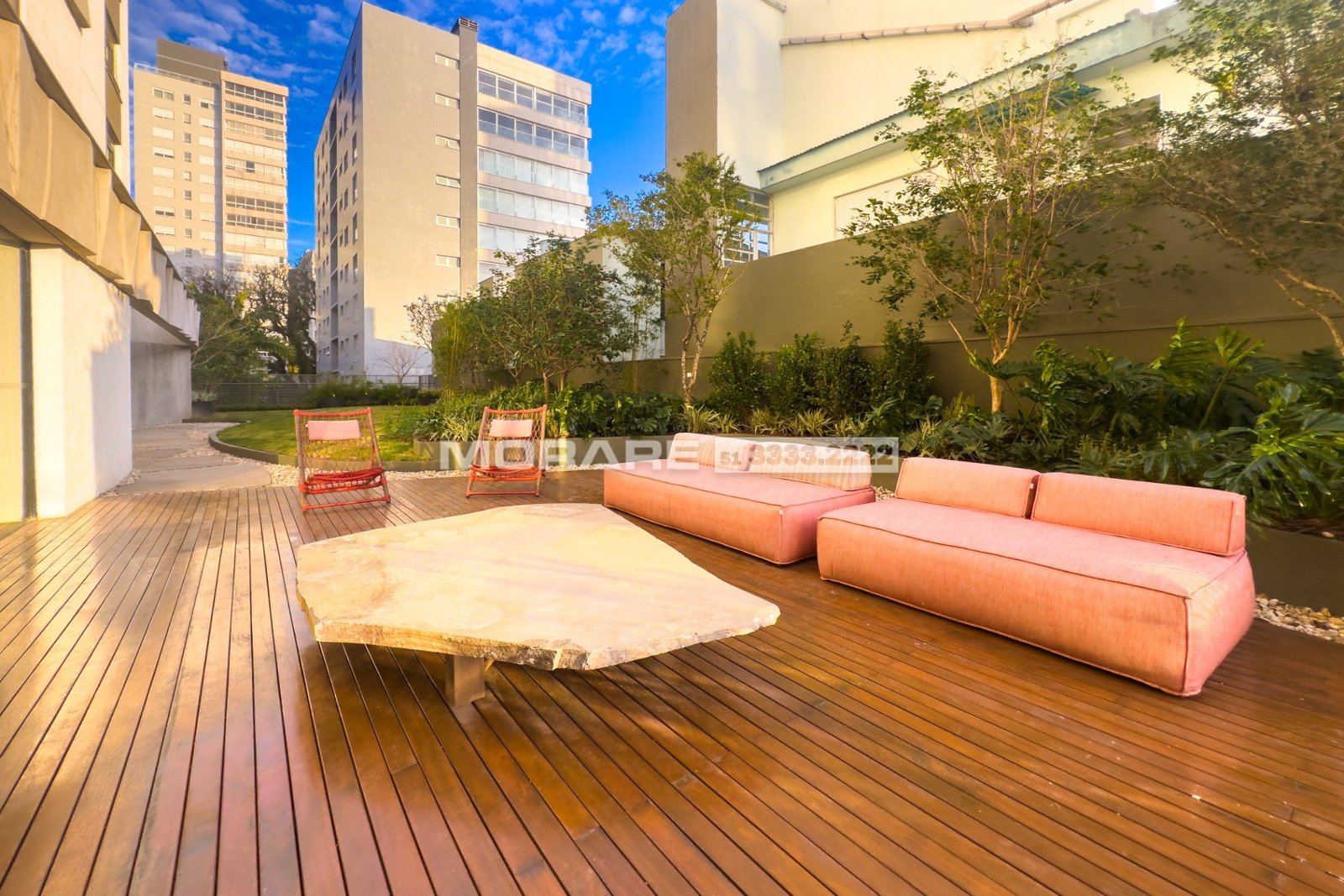Nos jardins, assinados pela paisagista Susana Nedel, espécies nativas se adensam para garantir privacidade e reforçar o aconchego. O deck estimula o banho de sol e leva à piscina aquecida com raia de 25m que convida a largas braçadas. Brinquedoteca montessoriana, playground ao ar livre, amplos gramados e um recanto exclusivo para os animas de estimação engrandecem a área de convívio e possibilitam um espaço protegido e seguro para a saúde, fora de casa. O recanto pet reserva um espaço exclusivo para exercitar e divertir os animais de estimação com mobiliário específico e cercamento para que eles corram livres e em segurança.