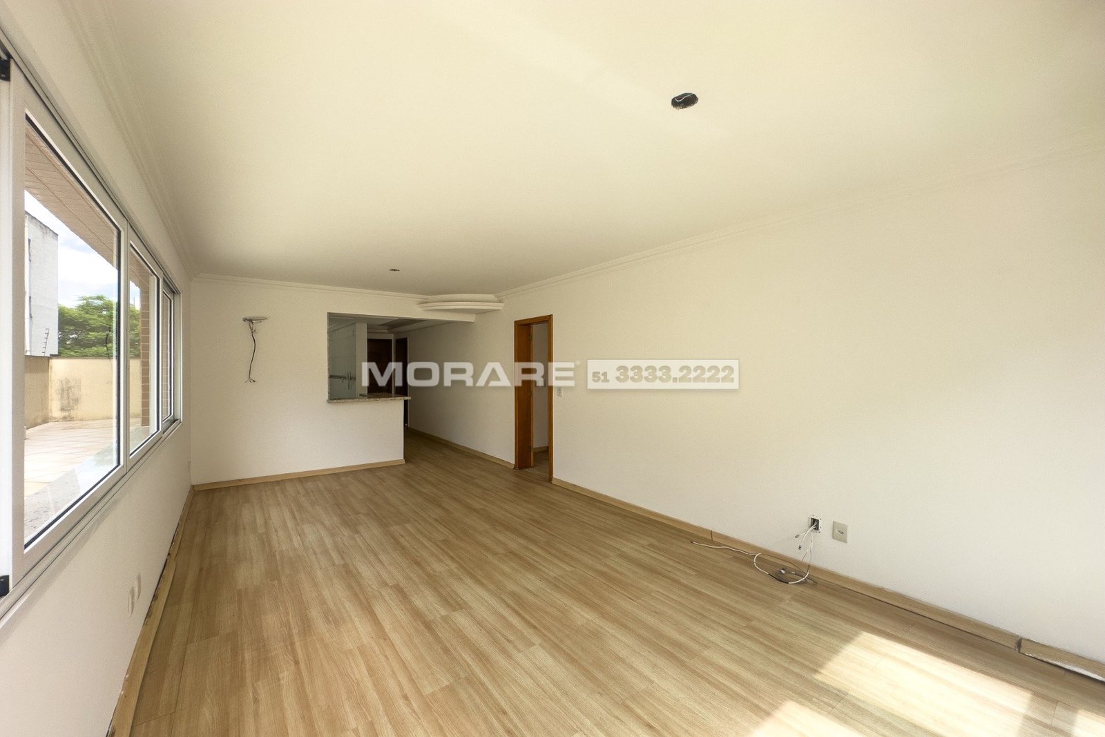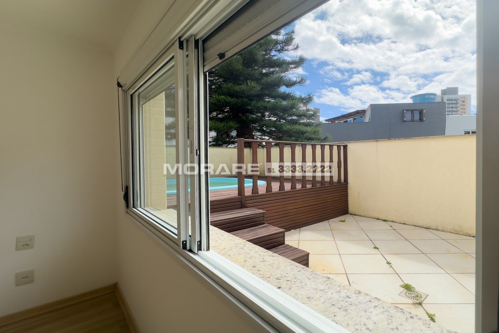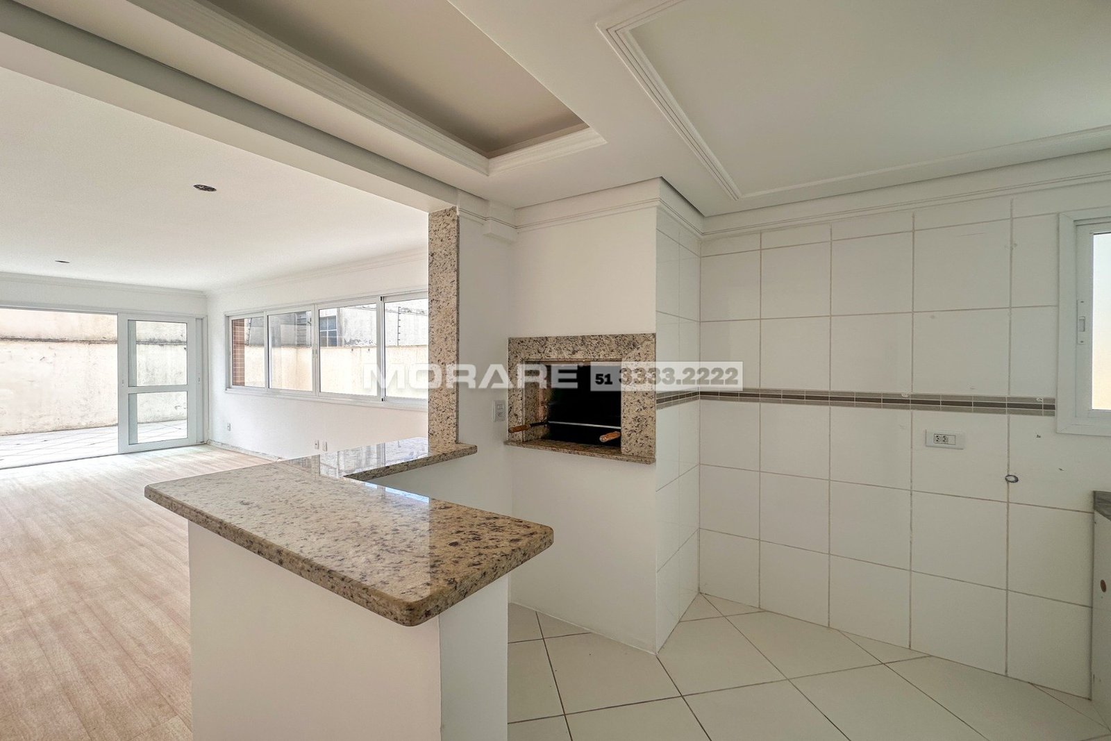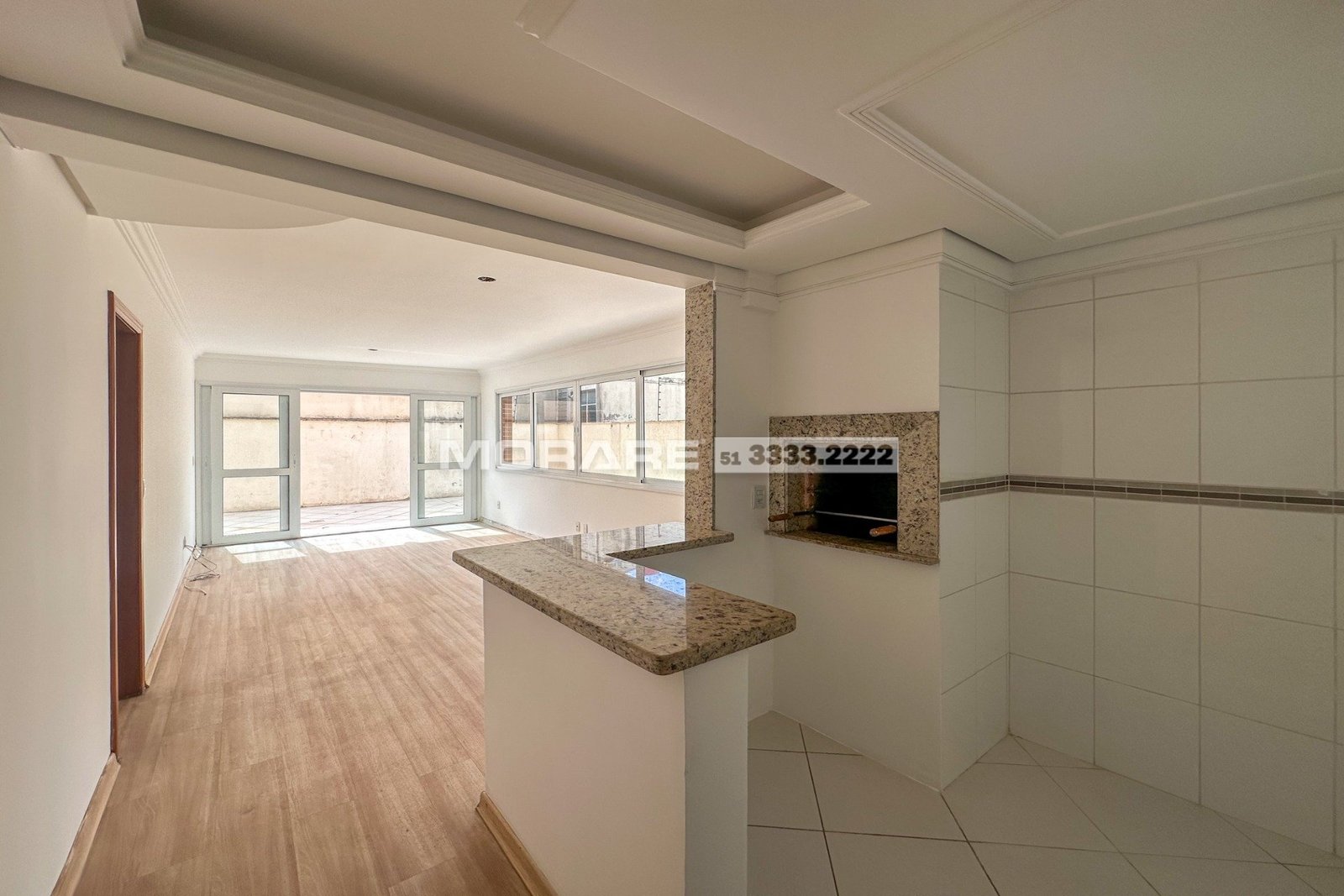 Living 2 ambientes com churrasqueira, cozinha e área de serviço separado, amplo terraço com piscina.