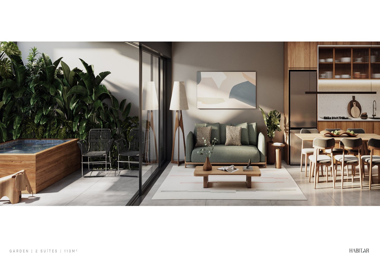 Essa unidade garden é perfeita para quem deseja integrar conforto e contato com o verde, sem abrir mão da exclusividade. Com 112,86m² privativos, o apartamento conta com 2 suítes, lavabo, living amplo com cozinha integrada e área de serviço independente.