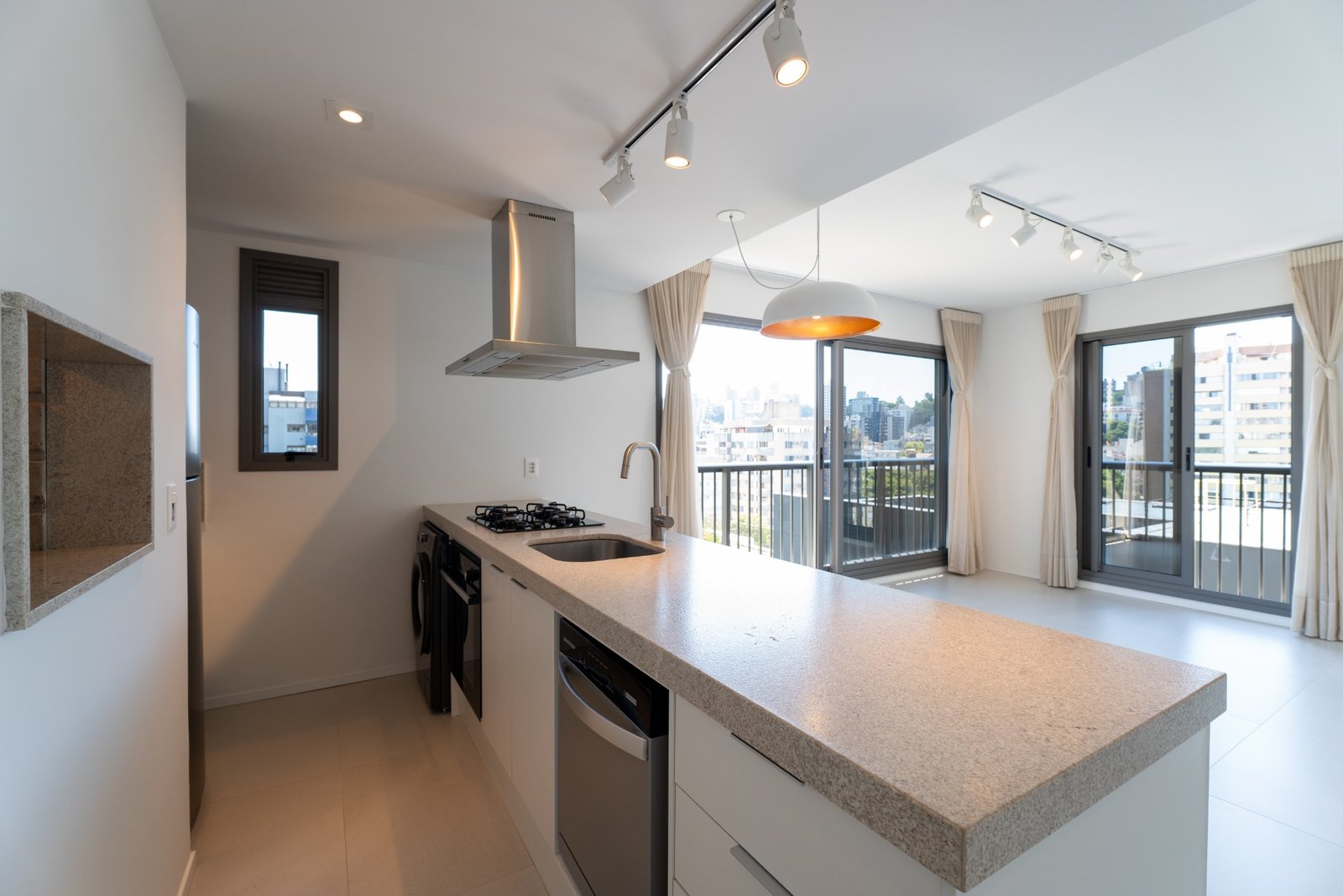 Com 65,75 m² de área privativa, o imóvel possui 2 dormitórios, sendo 1 suíte, banheiro social, cozinha integrada com churrasqueira e living com vista panorâmica.