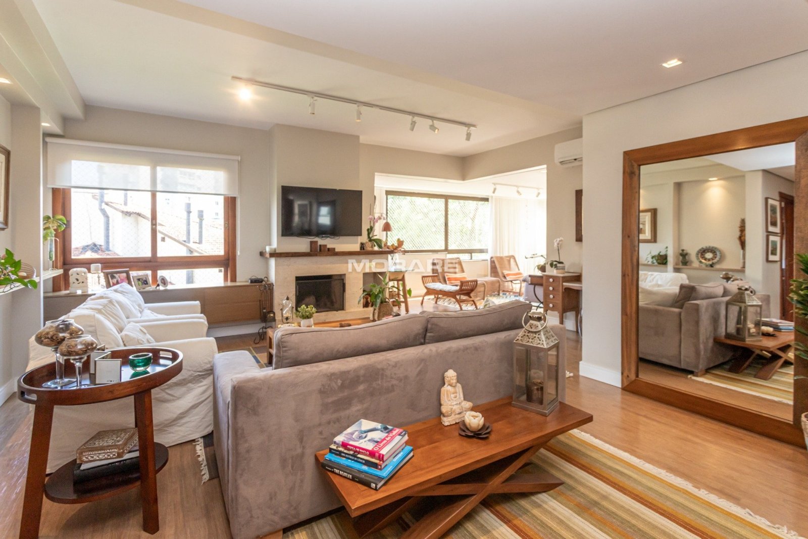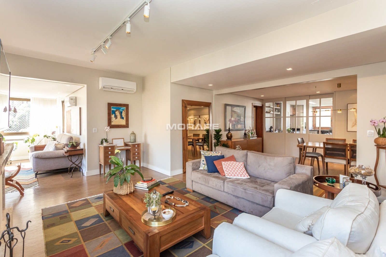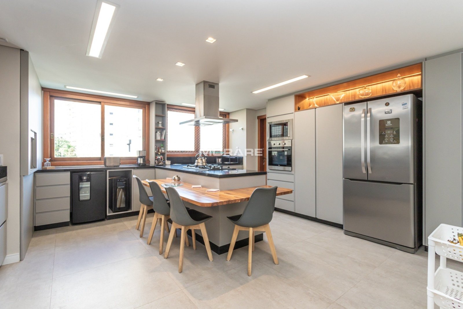 Com 208m2 de área privativa, de frente, living amplo para 3 ambientes com lareira, lavabo e integração com a ampla cozinha com churrasqueira, área de serviço separada e dependência completa. Posição solar Leste, Norte, Oeste.