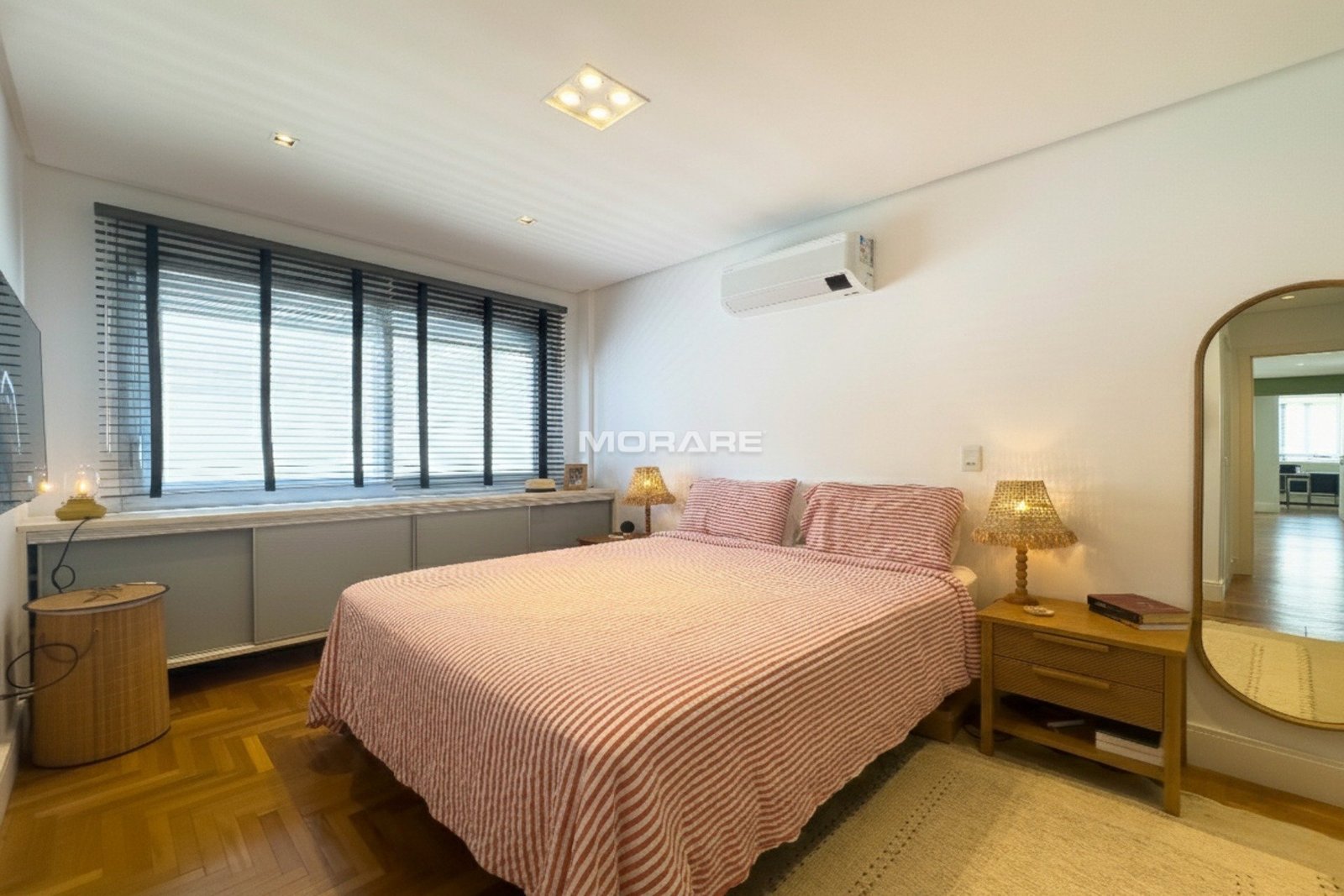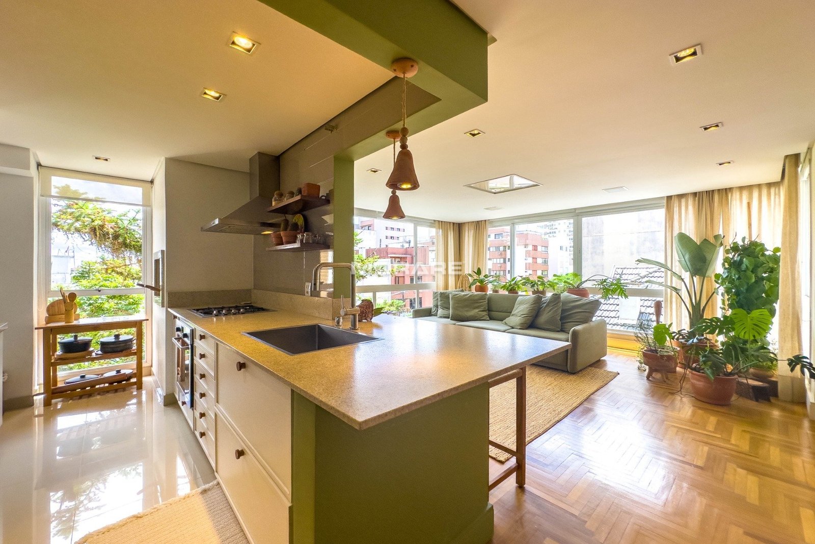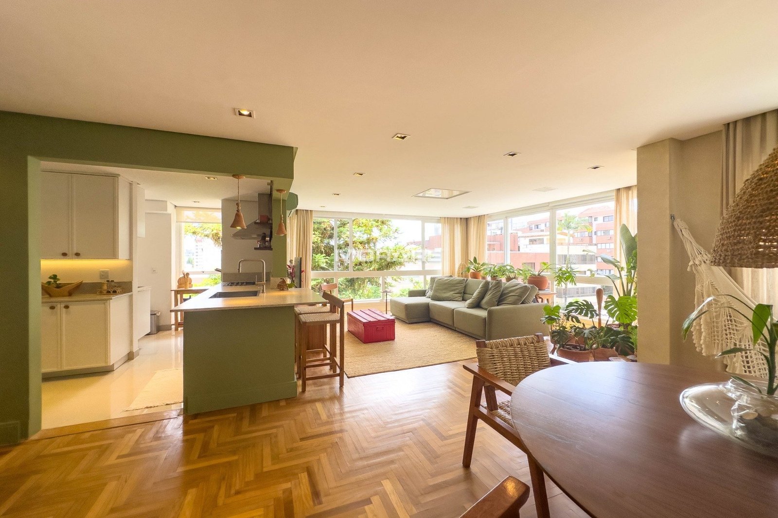 Apartamento 2 dormitórios transformados em 1 (fácil reversão), decorado por arquiteto, 2 banheiros com ventilação natural, amplo dormitório, living 2 ambientes, cozinha americana, área de serviço separada. Móveis fixos ficam no apartamento, piso madeira. iluminação natural, para pessoas com bom gosto, que apreciam originalidade.