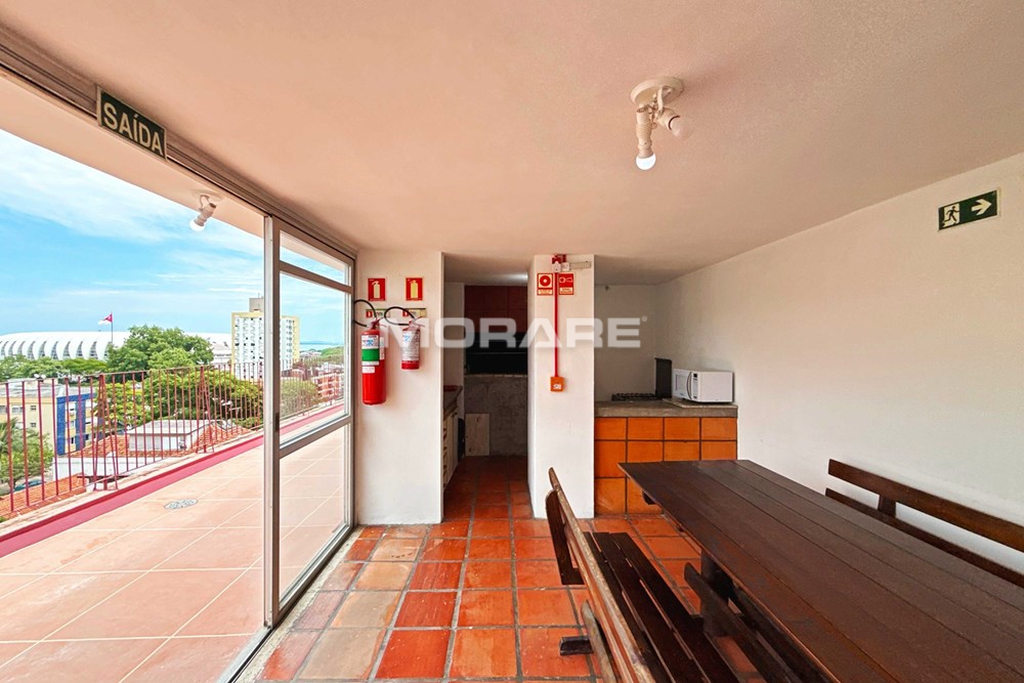 Um dos grandes destaques do empreendimento é o rooftop com salão de festas e churrasqueira, que proporciona uma experiência única. Do alto, a vista é de tirar o fôlego, com o Guaíba como cenário principal, revelando paisagens marcantes ao amanhecer, ao entardecer e nos fins de tarde inesquecíveis.